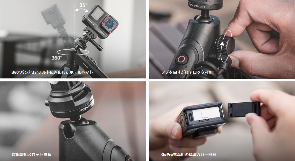 GoProシリーズとInsta360シリーズに対応し、壁掛けできるマンティスモードを含む4つのモードと自由雲台で、アクションカメラ撮影の幅を広げるミニ三脚