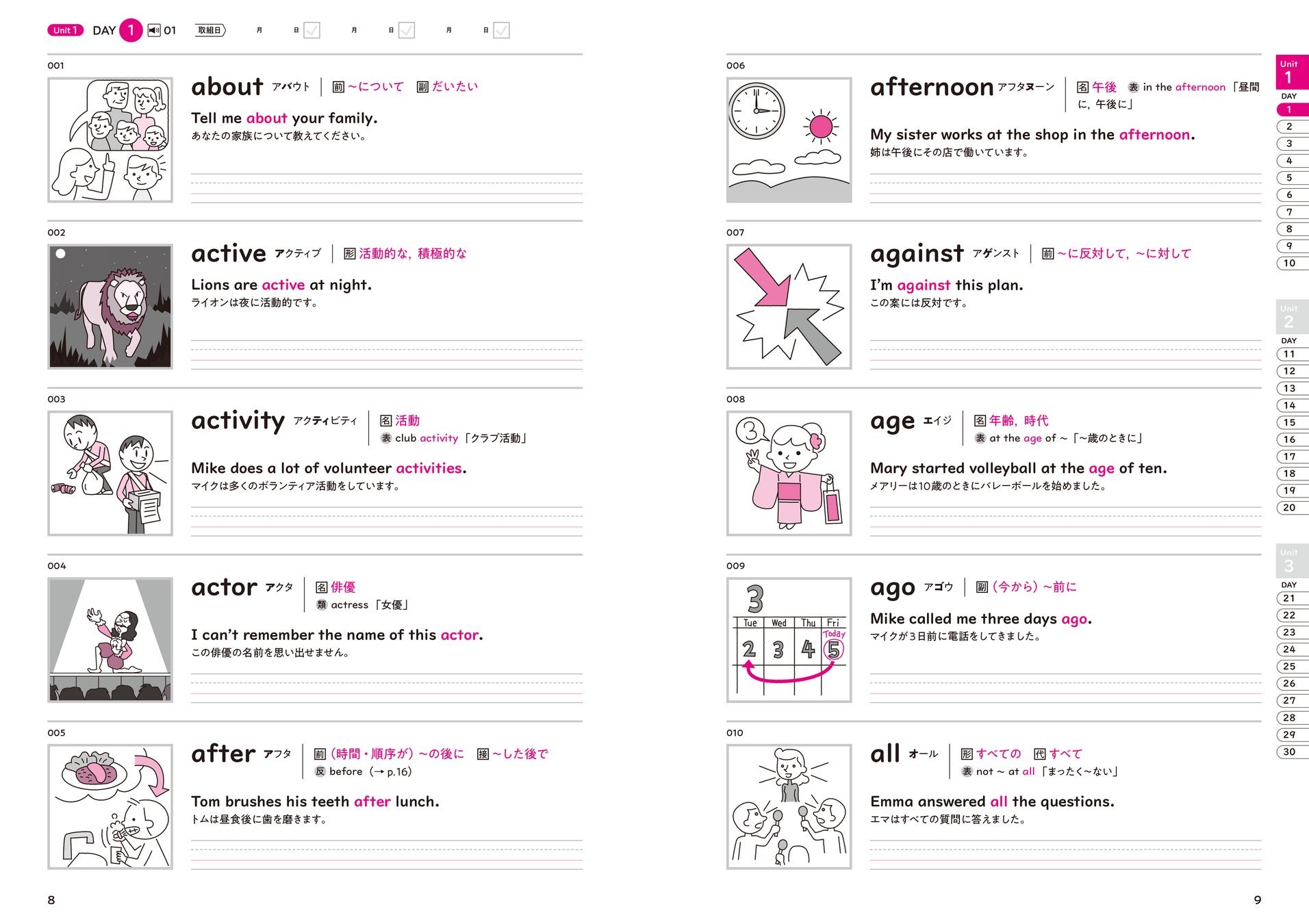 1日の学習は約4ページ。イラスト、音声、テストを活用して効率的に単語を覚えましょう。