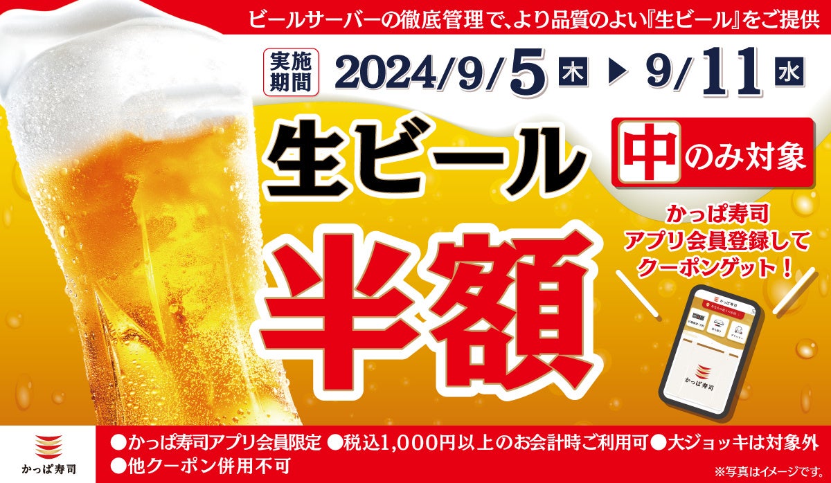コロワイドグループのかっぱ寿司(カッパ・クリエイト㈱ 本社:神奈川県横浜市、代表取締役社長:山角豪)は、2024年9月5日(木)〜9月11日(水)の期間、かっぱ寿司で利用できる「生ビール(中)半額クーポン」をかっぱ寿司アプリ会員に配信いたします。