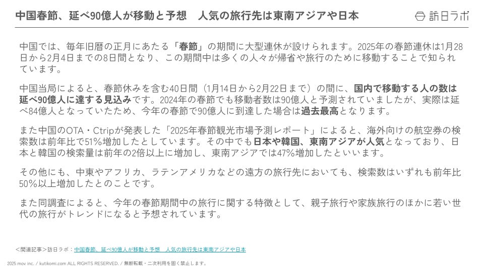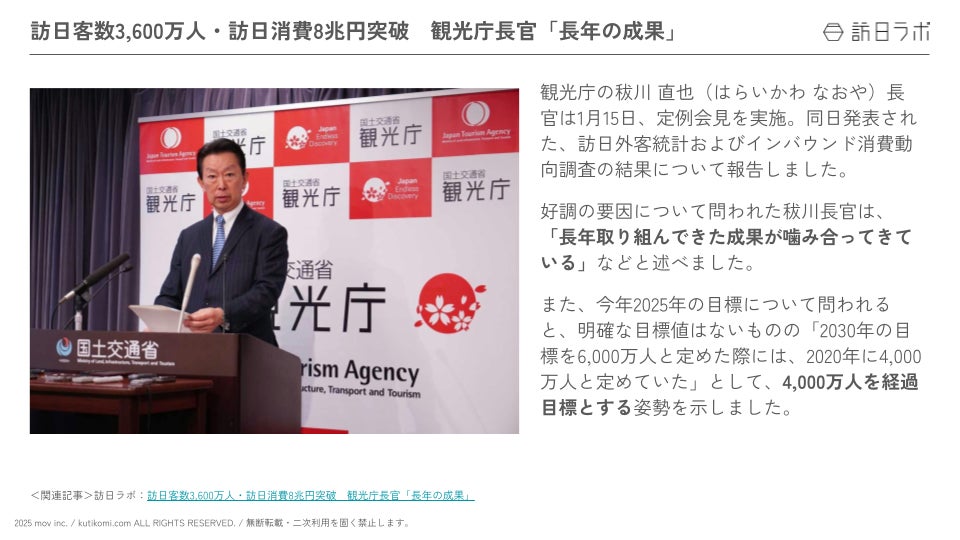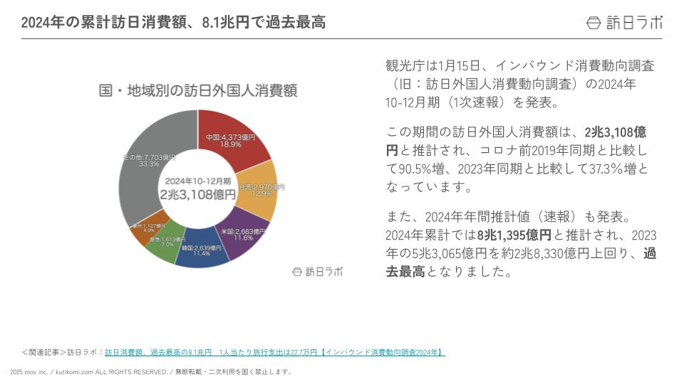 業界最大級のインバウンドビジネスメディア「訪日ラボ」及び 店舗向け集客一元化プラットフォーム「口コミコム」を運営する株式会社mov(代表取締役:渡邊 誠、本社:東京都渋谷区、以下mov)は、「インバウンドに関する最新トレンド・データ」「政府・自治体・企業などのインバウンド関連の取り組み」をはじめ、インバウンド対策に役立つニュースをまとめた「インバウンド情報まとめ【2025年1月前編】」を公開しました。