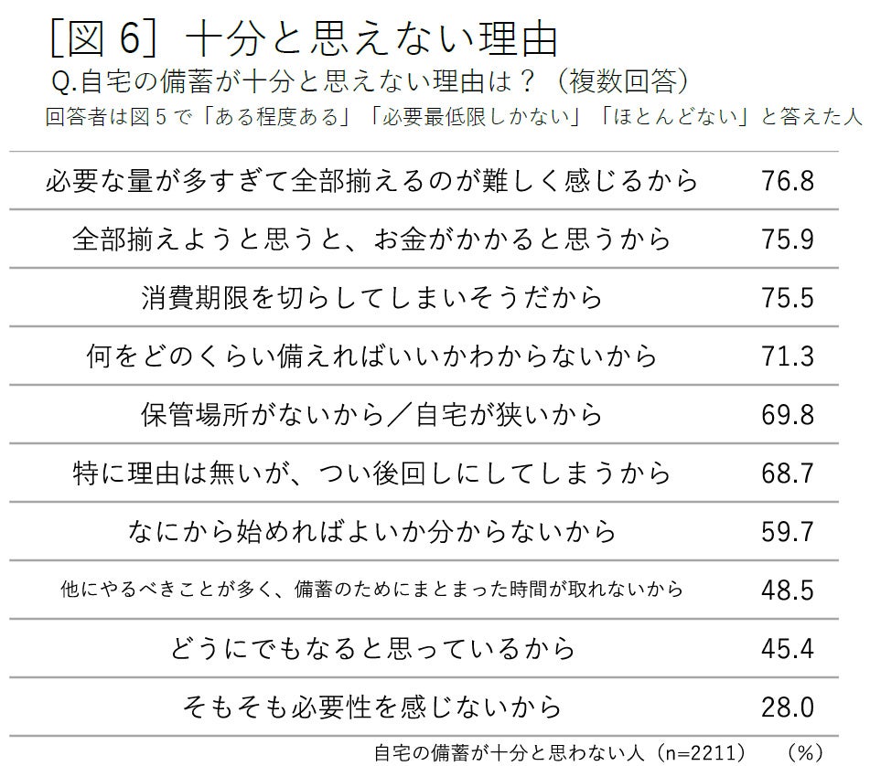 自宅の備蓄が十分と思えない理由を聞くと、「必要な量が多すぎて全部揃えるのが難しく感じるから」(76.8%)、「全部揃えようと思うと、お金がかかると思うから」(75.9%)といった理由が挙げられました[図6]。