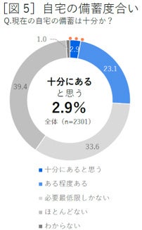 備蓄に対する意識を聞くと、85.0%が「備蓄をするなら必要な量や内容を揃えるべき」と答えている[図4]一方、自宅の備蓄は十分かと聞くと、「十分にあると思う」と答えた人はわずか2.9%しかいませんでした[図5]。