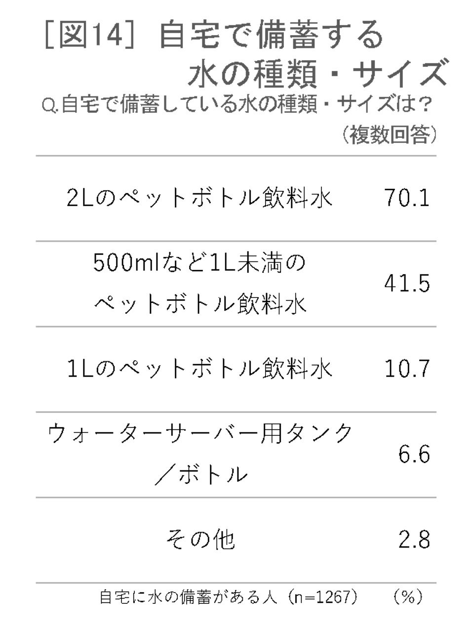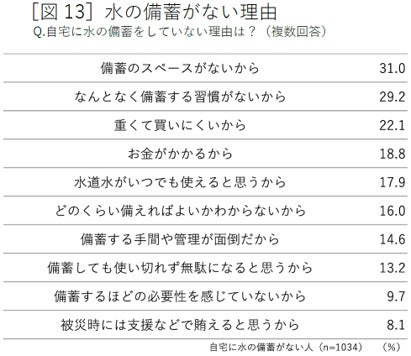 ここからは水の備蓄についての調査結果です。自宅の水の備蓄の有無について聞くと、全体の55.1%しか水の備蓄が「ある」と答えていません[図12]。水の備蓄がないと答えた人に水を備蓄しない理由を聞くと、「備蓄のスペースがない」(31.0%)、「なんとなく備蓄する習慣がない」(29.2%)が挙げられました[図13]。備蓄している水の種類・サイズを聞くと、「2Lのペットボトル飲料水」(70.1%)が最も多く、「500mlなど1L未満のペットボトル飲料水」(41.5%)、「1Lのペットボトル飲料水」(10.7%)の順となりました[図14]。