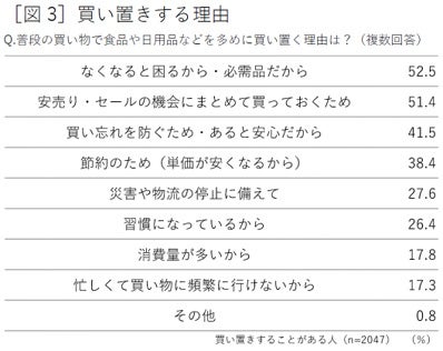 買い置きする理由を聞くと、「なくなると困るから・必需品だから」(52.5%)や「安売り・セールの機会にまとめて買っておくため」(51.4%)といった理由が多くなっています。「災害や物流の停止に備えて」(27.6%)という、もしもに備えて買い置きをする人は少ないものの、結果的に家庭にストックがある“無意識の備蓄層”が多いことが分かりました[図3]。