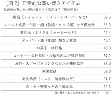 買い置きをする人にそのアイテムを聞くと、ティッシュ・トイレットペーパーなどの「日用品」(69.6%)、レトルト食品・缶詰・麺(乾麺・カップ麺)などの「保存食」(55.3%)、ミネラルウォーターなどの「飲料水」(42.4%)が上位に挙げられました[図2]。