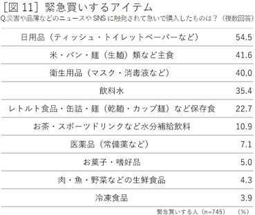 飲料水や食料、日用品などの「備蓄が足りなくなること」に不安を感じるかと聞くと、81.5%が「不安に感じる」と答えています[図9]。また、災害や品薄などのニュースやSNSに触発されて、急いで買いものに出た経験を聞くと、32.4%と約3人に1人が「経験がある」と答えています[図10]。具体的なアイテムを聞くと、ティッシュ・トイレットペーパーなどの「日用品」(54.5%)、米・パン・麺(生麺)類などの「主食」(41.6%)、マスク・消毒液などの「衛生用品」(40.0%)、ミネラルウォーターなどの「飲料水」(35.4%)が多くなっています[図11]。日常的な買い置きアイテム(図2参照)と比べ、主食や衛生用品を緊急で買い足すことが多いようです。
