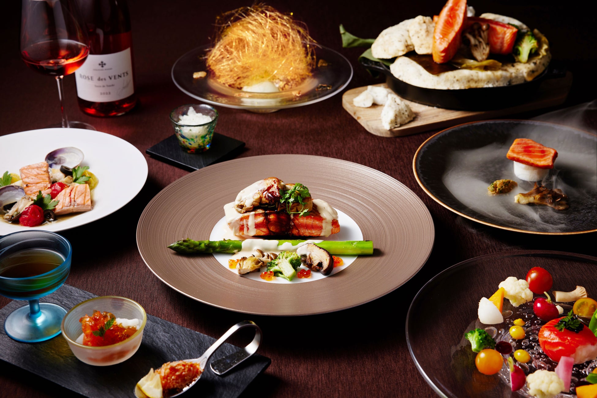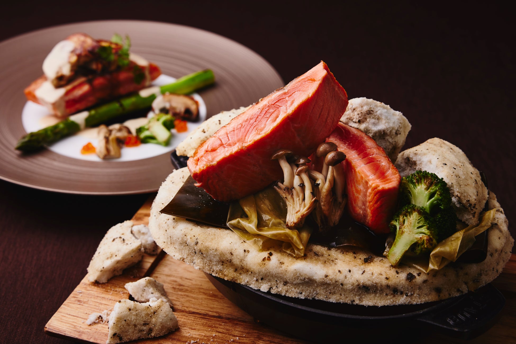 鮭の様々な部位を使ったコース料理です。鼻先から背、腹まで、それぞれを「焼く」「煮る」「揚げる」「凍らす」「燻す」という調理法を用いて、鮭を余すことなく提供します。今年はメイン料理として「昆布香る鮭の塩釜包み焼き」が登場します。これは、脂が少なくさっぱりとした味わいが特徴の秋鮭を昆布で覆い、包み焼きにした一品です。鮭に含まれているビタミンDと、昆布に含まれるカルシウムは相性が良いと言われており(*2)、一緒に食べることで鮭と昆布の栄養をより効果的に摂ることが期待できます。