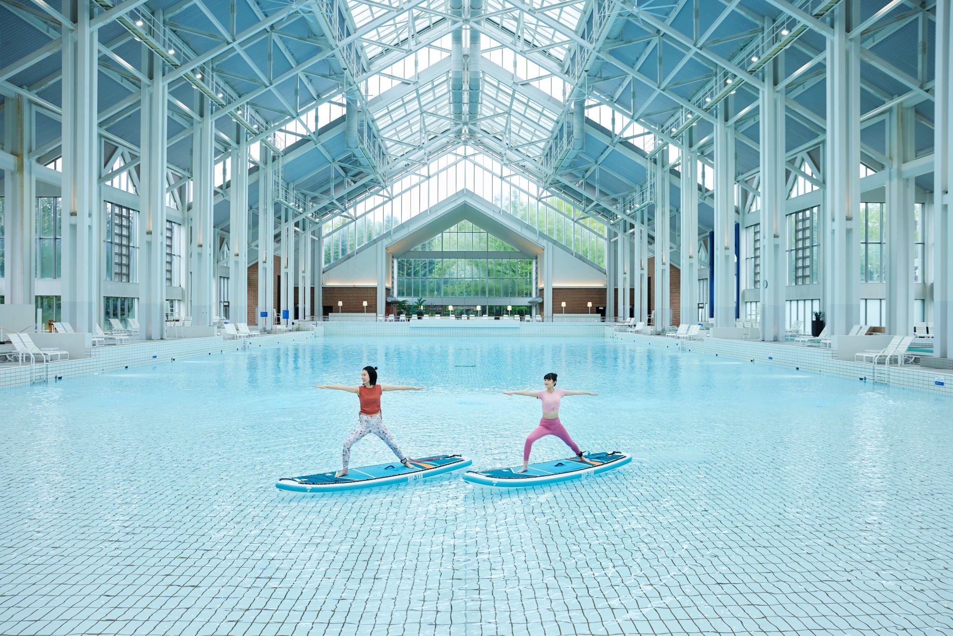 当リゾート内にあるインドアウエーブプール「ミナミナビーチ」では、本プラン利用者限定で「鮭SUP YOGA」を体験できます。これは、いくらから稚魚、成魚になるまでの過程をイメージし、ポーズの流れを構成したヨガです。鮭の成長をイメージしたヨガで身体を動かしたり、ヨガの呼吸法を行なったりすることで、自律神経が整い心と身体をリラックスさせることが可能です。身体を動かした後は、ミナミナビーチに併設された露天風呂「木林の湯」で汗を流してリフレッシュできます。