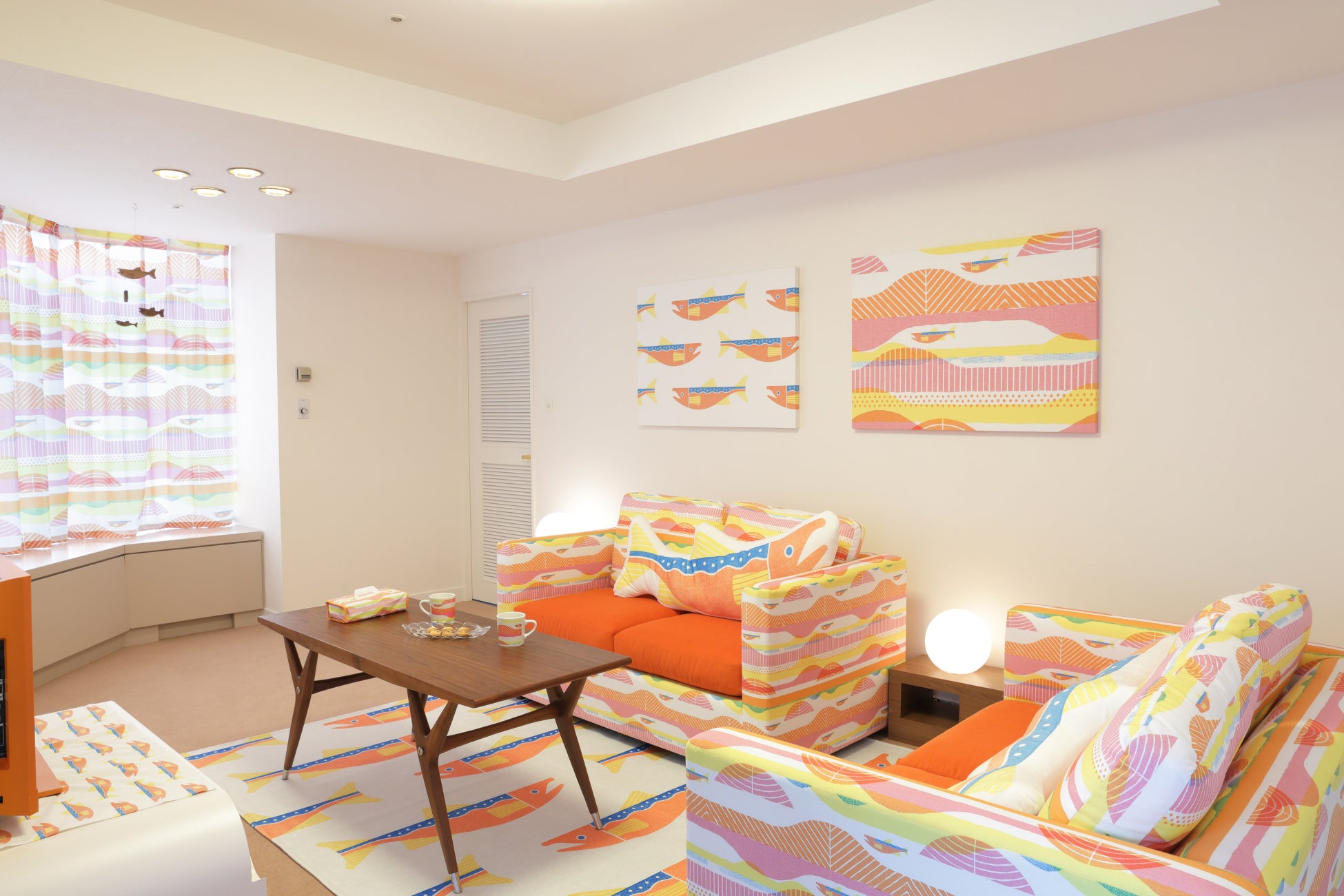 秋の北海道を代表する食材の1つである鮭を、滞在を通して感じていただきたいという思いで、2017年9月に誕生した客室です。客室には、鮭の切り身や姿を基調としたデザインのソファやカーテン、クッションやマグカップなどを設えています。ベッドルームは、川を泳ぐ鮭を表現した空間です。ベッドフレームには、川で鮭を狙う親子のクマが描かれており、鮭の顔がデザインされたナイトキャップとパジャマを着ると、鮭になった気分を味わえます。