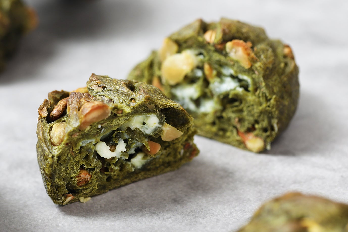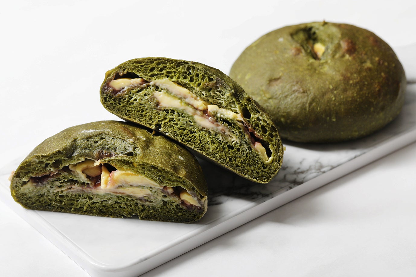 "抹茶好き" "ハード系のパンが好き" な方におすすめの新商品。アーモンド、クルミ、マカデミアとホワイトチョコを、抹茶のライ麦生地に練り込みました。 食べるたびに異なるナッツの風味や食感をお楽しみいただけます。