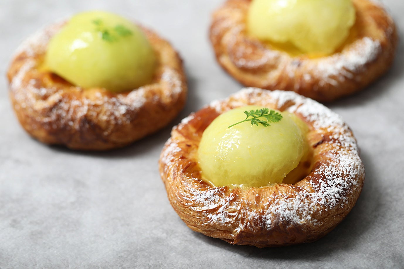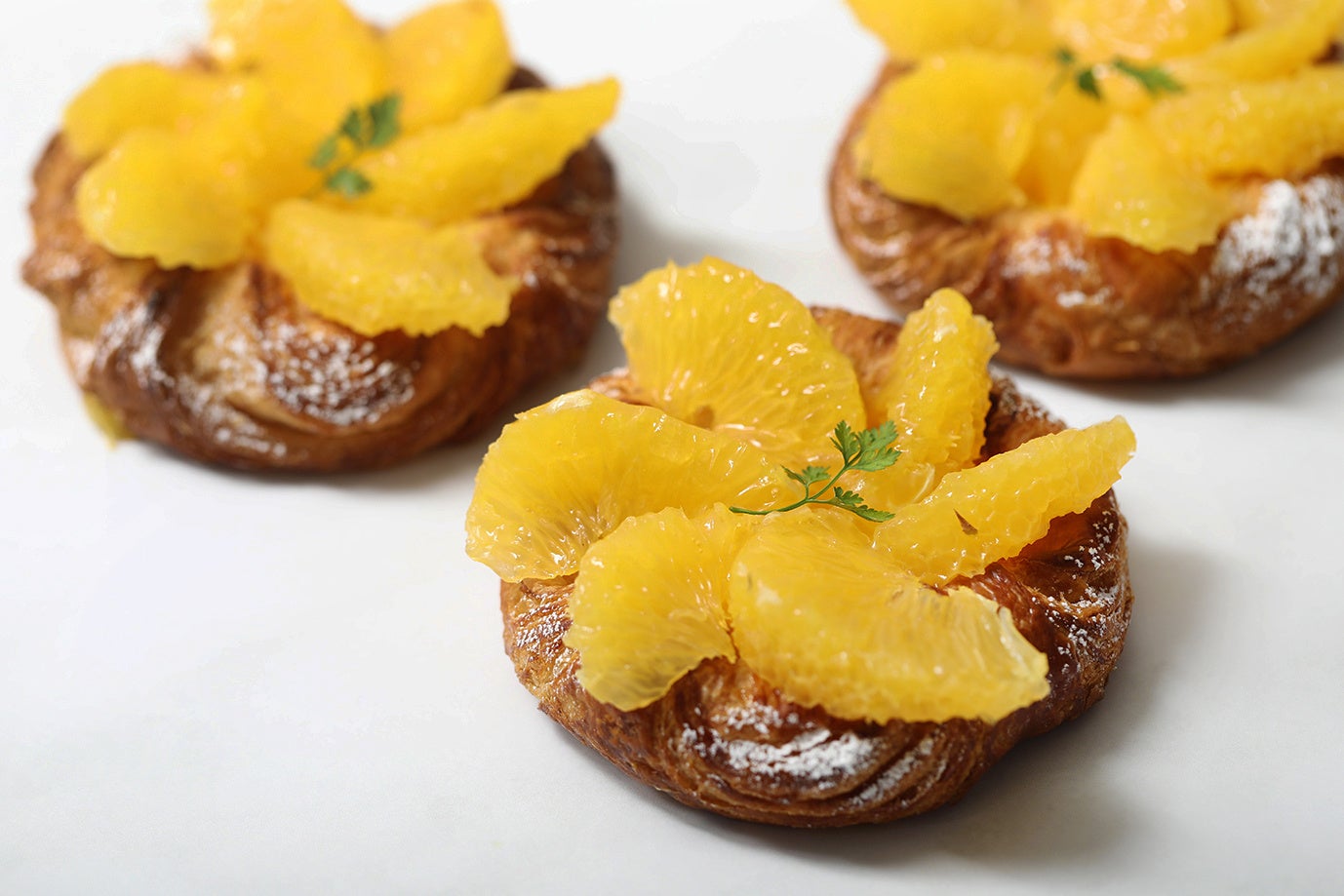 発酵バターを練りこんだ風味豊かなデニッシュ生地に、カスタードクリームとフレッシュな夏みかんをトッピングいたしました。夏みかんの甘みの中にほのかに感じる酸味が初夏にぴったり。みずみずしく爽やかな味わいをお楽しみいただけるデニッシュです。