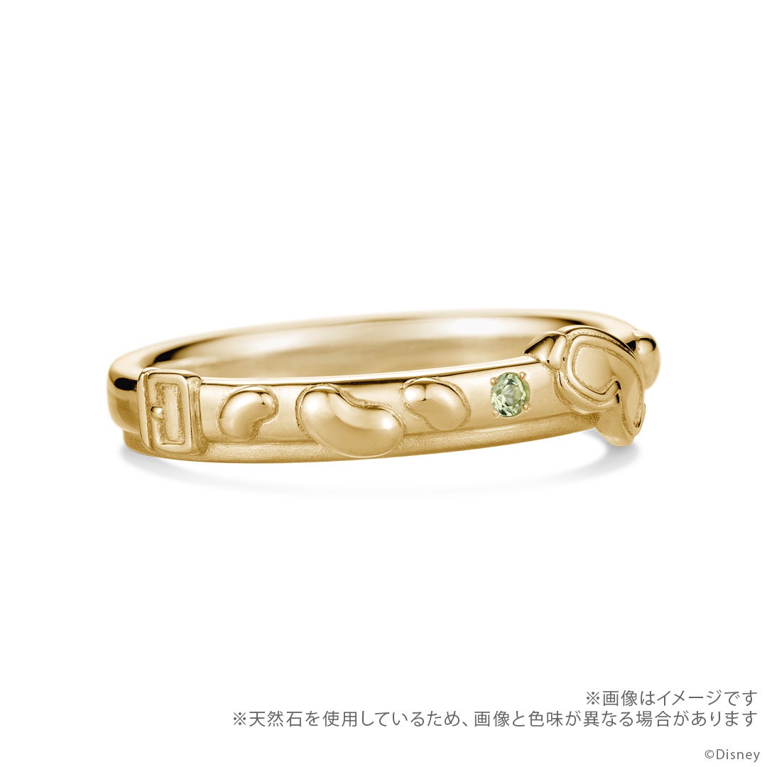 『ディズニー ツイステッドワンダーランド』の期間限定イベントをモチーフにしたリング。 それぞれのイベントの世界観やイメージ、登場アイテムなどを普段のファッションに取り入れられるようジュエリーに落とし込みました。 「ハッピービーンズデー」モデルは、農民チームや怪物チームが使用する競技アイテムをイメージ。 ところどころにビーンズやゴーグルのモチーフを散りばめ、”竪琴”を巡り勝敗を競い合うナイトレイブンカレッジの伝統行事を表現しました。 ベルトに見立てたリングの中央には、ビーンズをイメージしたペリドットを留めています。 |