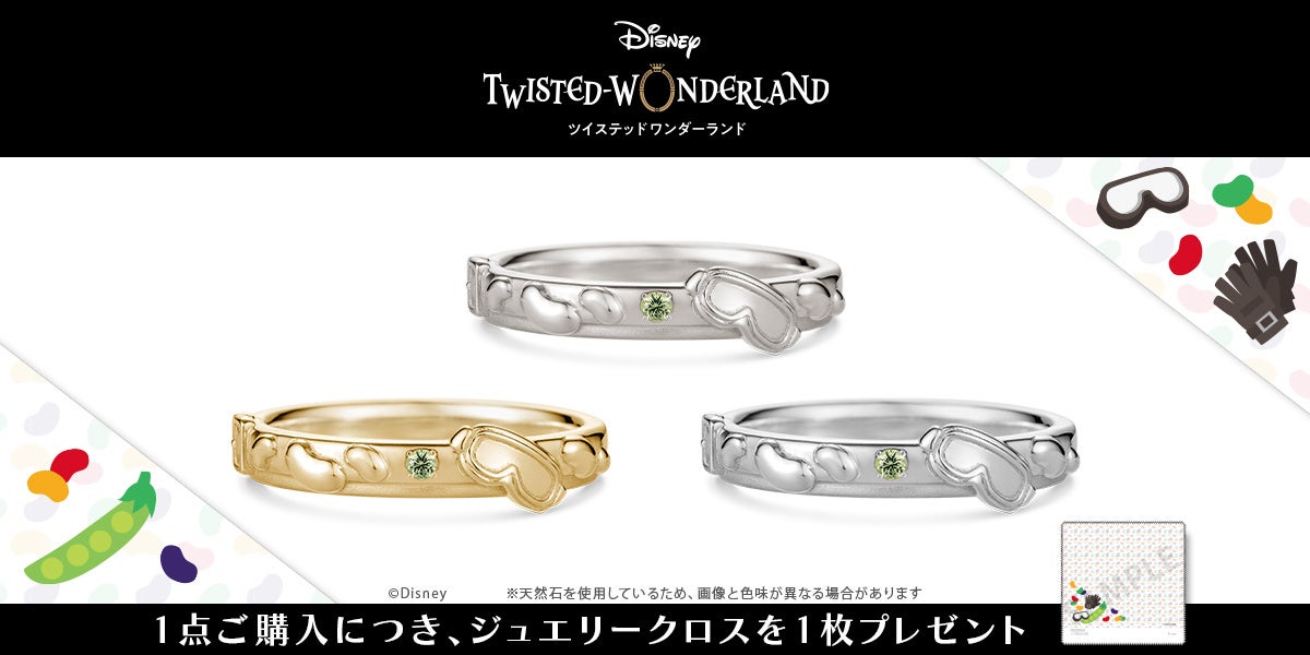 このたびの新作は、『ディズニー ツイステッドワンダーランド』の期間限定イベント「ハッピービーンズデー」をモチーフにしたリング(指輪)です。ご購入特典として「ハッピービーンズデー」をモチーフにしたジュエリークロスをご用意しました。