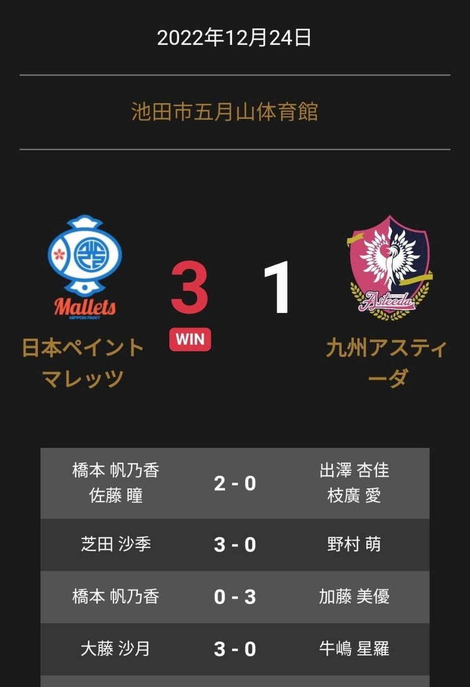 ノジマTリーグ 2022-2023シーズン 公式戦 12月24日開催 日本ペイントマレッツ vs 九州アスティーダ 試合結果