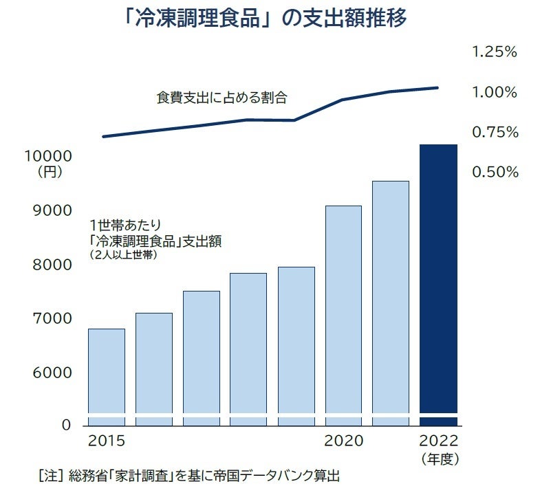 「冷凍餃子の無人販売ビジネス」は、手軽な調理で人気が高い「餃子」を、巣ごもり下の買いだめ需要を受けた「冷凍食品」としたことで、消費者に受け入れられる余地が広がった。総務省の家計調査によると、冷凍餃子を含む2022年度の冷凍調理食品の支出額は、1世帯当たり1万円を超え15年度以降で最高だった。また、24時間営業による利便性の高さ、つり銭が不要な30~40個・1000円の価格設定なども、消費者の認知度を大きく高めた要因となった。