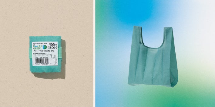 【内容】コンビニ弁当のサイズにあったエコバッグです。使用済みペットボトルから作った再生ポリエステルを使用しています。内側にシリコーンが塗布されておりすべりにくい仕様です。