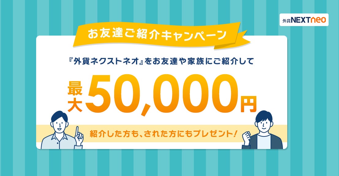 株式会社外為どっとコム(本社:東京都港区、代表取締役社長:竹内 淳)は、店頭FX『外貨ネクストネオ』にて、「お友達ご紹介キャンペーン」を2025年4月1日(火)より実施します。