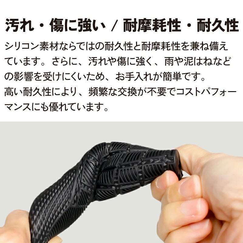 この自転車グリップは、シリコン素材ならではの耐久性と耐摩耗性を兼ね備えています。