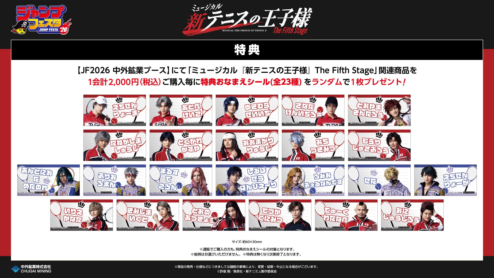 中外鉱業ブースにて「ミュージカル『新テニスの王子様』The Fifth Stage」JF2026関連商品を1会計2,000円(税込)ご購入毎に、特典おなまえシール(全23種)をランダムで1枚お渡しいたします!