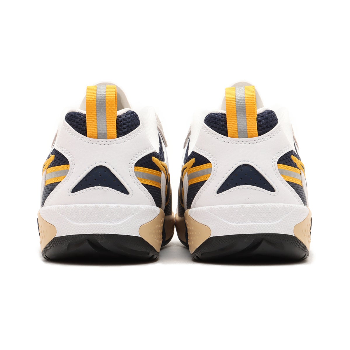 注目の新カラーは、人気のミシガンカラーを彷彿とさせるカラーウェイが特徴。ホワイト、ミッドナイトベイビー、ユニバーシティゴールドという伝統的な組み合わせカラーと“JAM”の複雑に重なり合うパーツを際立たせる白黒のカラーリングで登場!練習から普段使いしやすい一足となっています。