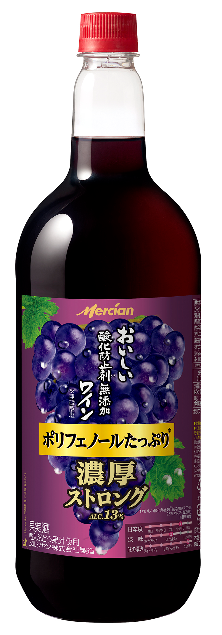 今回発売する「おいしい酸化防止剤無添加赤ワイン 濃厚ストロング」は、ワインに濃厚な味わいと飲みごたえを求めるお客様のお声にお応えし、ロングセラーブランドの「おいしい酸化防止剤無添加ワイン」シリーズの持つ安心感はそのままに、ブドウ本来の濃さを感じられる果汁や酵母を厳選しポリフェノールをたっぷり含有することで、濃厚な味わいと、飲みごたえを高めました。