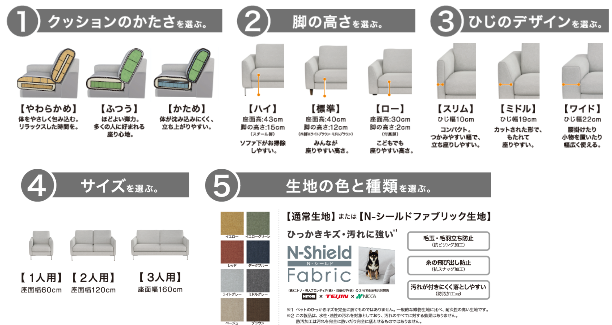 生地の色は8色展開で、キズや汚れに強くお手入れが簡単なNシールド生地にも変更していただけます。