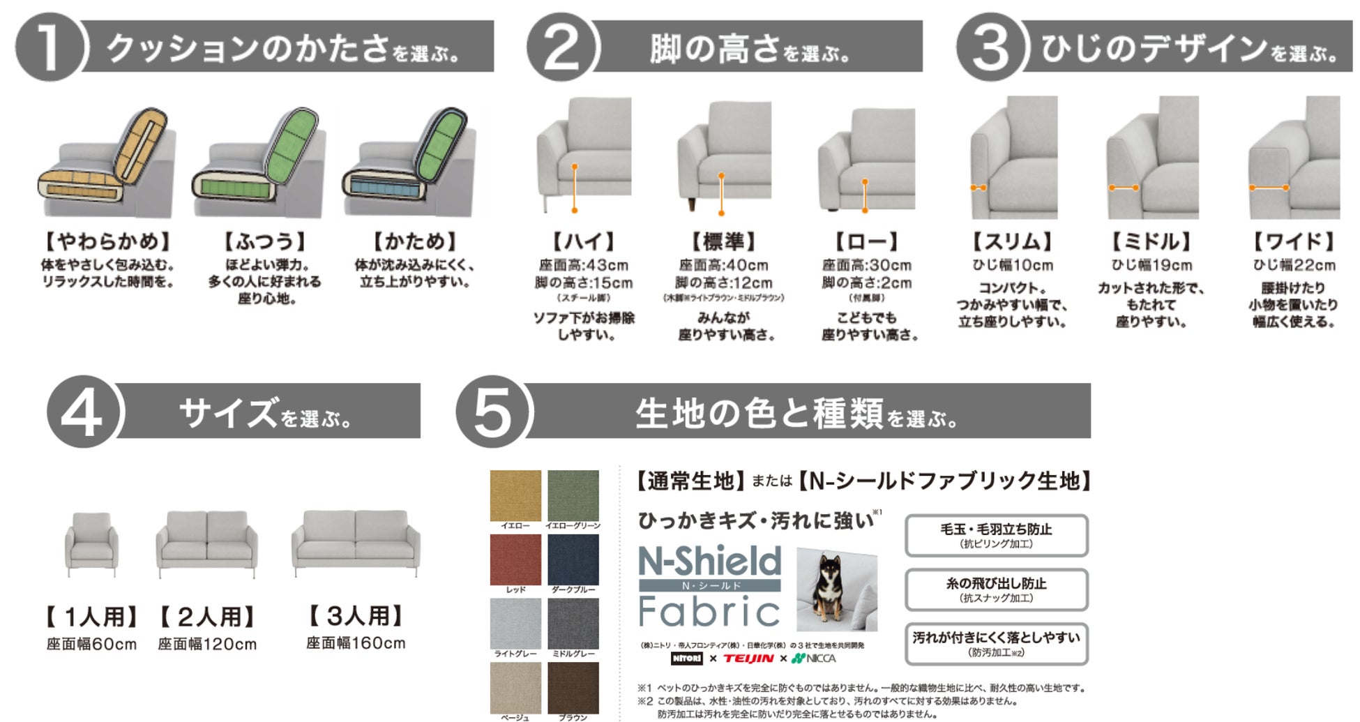 ニトリのカスタマイズソファMS02であれば、好みの座り心地・デザインを選べます。