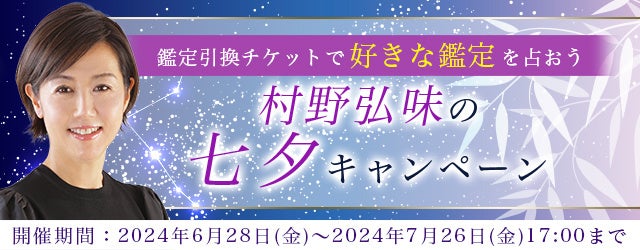 TV番組『突然ですが占ってもいいですか?』出演で話題の占い師・村野弘味の公式占いサイト「村野弘味の九星気学」では、『七夕キャンペーン』を開催中です。キャンペーン期間中、対象鑑定を占っていただくたびに、「鑑定引換チケット」をお贈りいたします。チケット1枚につき、お好きなキャンペーン限定の鑑定1つと交換することができます。こちら期間限定のキャンペーンとなっておりますので、是非「村野弘味の占い」で、あなたの運勢を占ってみてください。