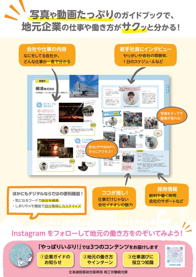 このような現状に加え、胆振地域の特色であるものづくり産業では人材不足が大きな課題であったことから、高校生が地元企業を気軽に知れる媒体として、企業の仕事内容や若手社員のインタビュー・1日のスケジュール、採用情報などを掲載したデジタルガイドブックを作成しました。