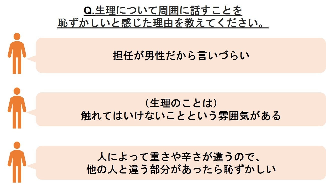 生理について「周囲に話すことを恥ずかしいと感じたことがあるか」という問いに対し、59.7%が「はい」と回答。恥ずかしいと感じる理由として、「男性がいる時は話さない」「担任が男性だから言いづらい」といった異性に対しての話しづらさのほか、「体に関するデリケートな話題」「(生理のことは)触れてはいけないことという雰囲気がある」などデリケートな話題としての認識、「人によって重さや辛さが違うので、他の人と違う部分があったら恥ずかしい」などの個人差への不安が主な要因として挙げられました。