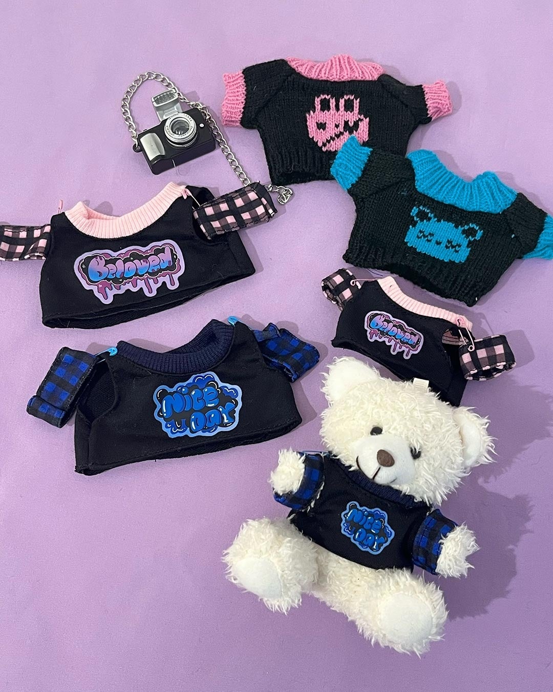 ◆ぬいぐるみ用セーター、ぬいぐるみ用服(10cm、20cm)、ぬいぐるみ用カメラ/各390円(税込429円)