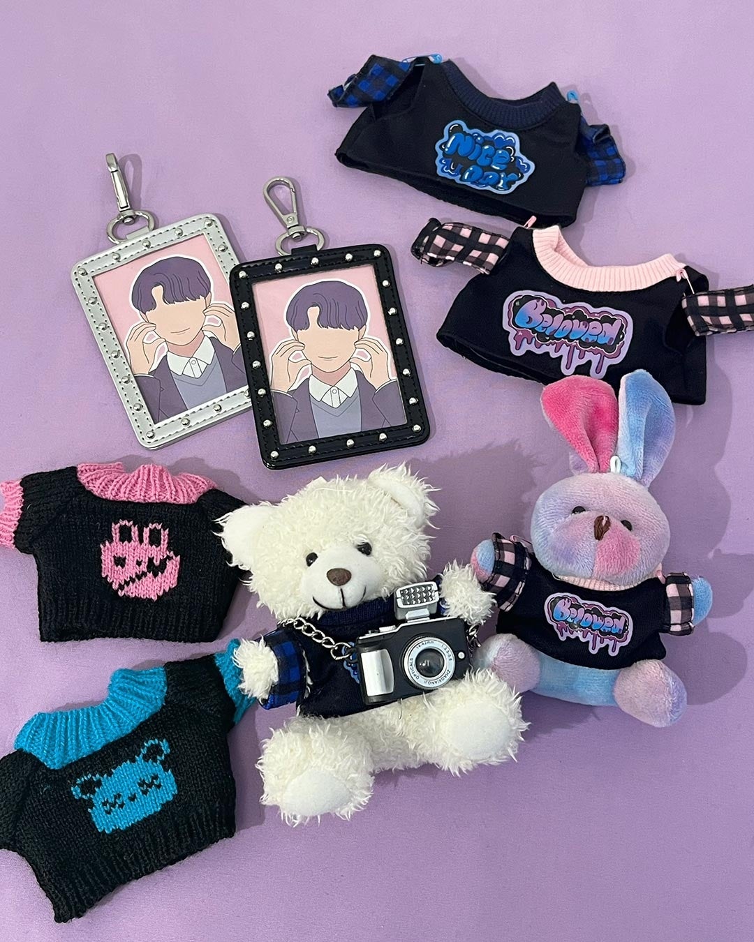 「ぬいぐるみ用服」や「ぬいぐるみ用セーター」は、黒×ピンク、黒×ブルーの2色展開で、ぬい同士のお揃いや、モード系のスタイリングを楽しめます。