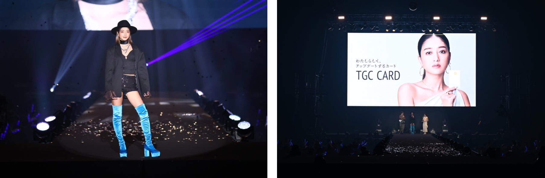 TGC公式カード「TGC CARD」のステージに、イメージキャラクターを務める池田美優が、TGC北九州のテーマカラーでもある鮮やかなブルーの、美脚際立つロングブーツが印象的なウエスタン調のスタイリングで登場。「TGCの先行チケットがゲットできたり、映画が安く観られたり、色々な特典があって本当にお得なんですよ!」と、豪華な「TGC CARD」会員限定コンテンツなど、その魅力を紹介しました。