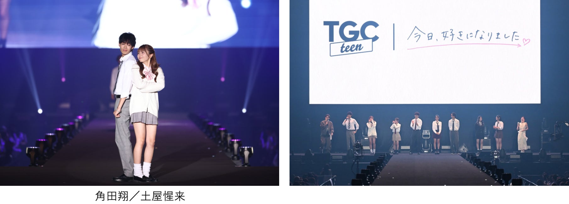 TGCがプロデュースする“令和teen”のためのガールズフェスタ「TGC teen」と、リアルで等身大な、本気の“恋”と“⻘春”を追いかけるABEMA恋愛番組「今日、好きになりました。」シリーズのスペシャルコラボレーションステージでは、ティーンに絶大な人気を誇る同作品出演メンバーから、米澤りあ、黒木聖那、平松想乃、榊原樹里、小國舞羽、Baoら、豪華6名のメンバーが登場。さらに、2024年10月7日(月)に最終話を迎えた「ドンタン編」で成立したばかりの角田翔、土屋惺来カップルが初ペアランウェイ♡ランウェイトップでは、背中あわせで視線を交わすと、ぎゅっと手を握り合ってニッコリ。初々しい2人の姿に、会場は大歓声に包まれました。