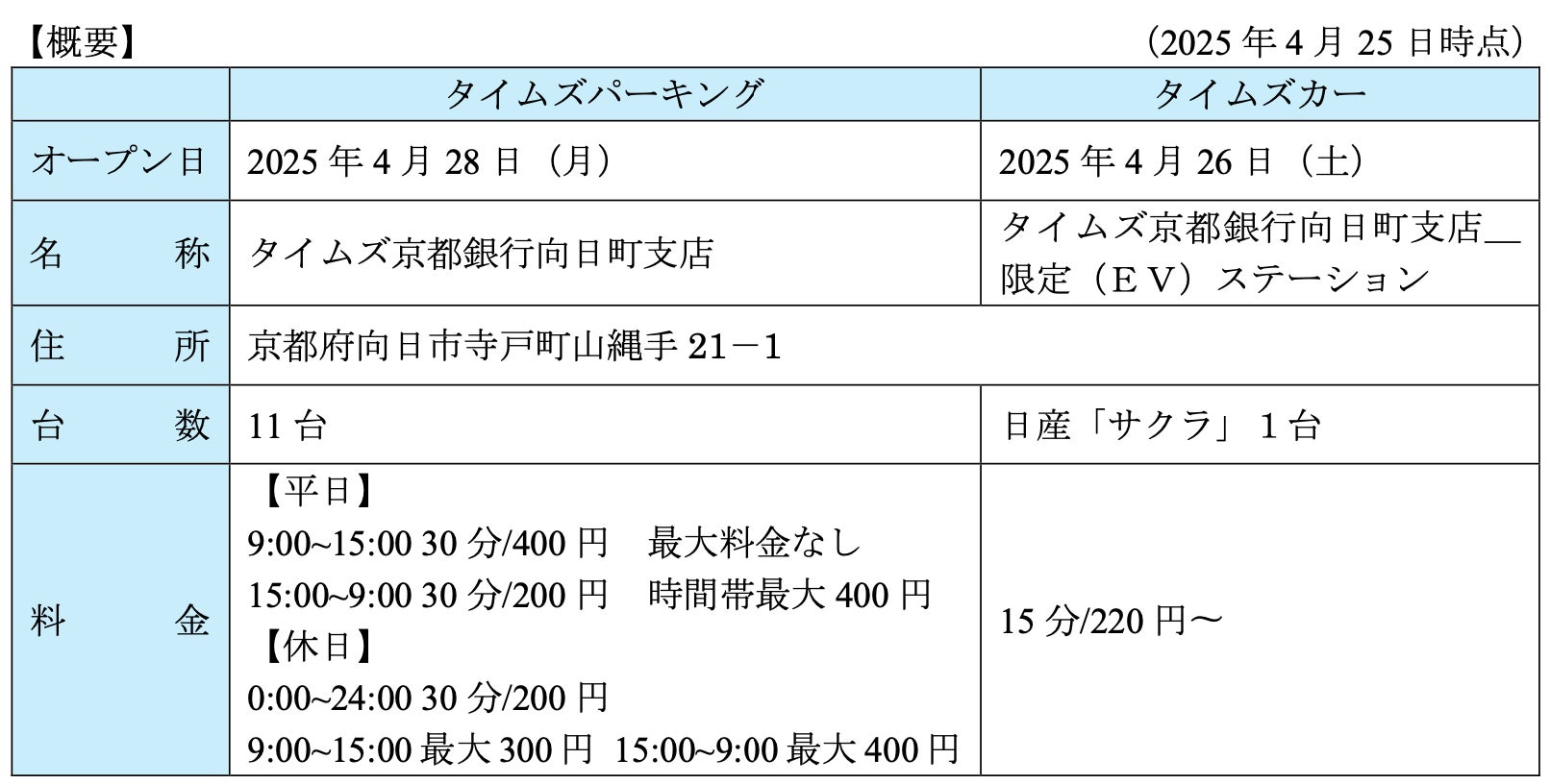 タイムズパーキングおよびタイムズカーステーションを「京都銀行 向日町支店・東向日町支店」の来客用駐車場に開設