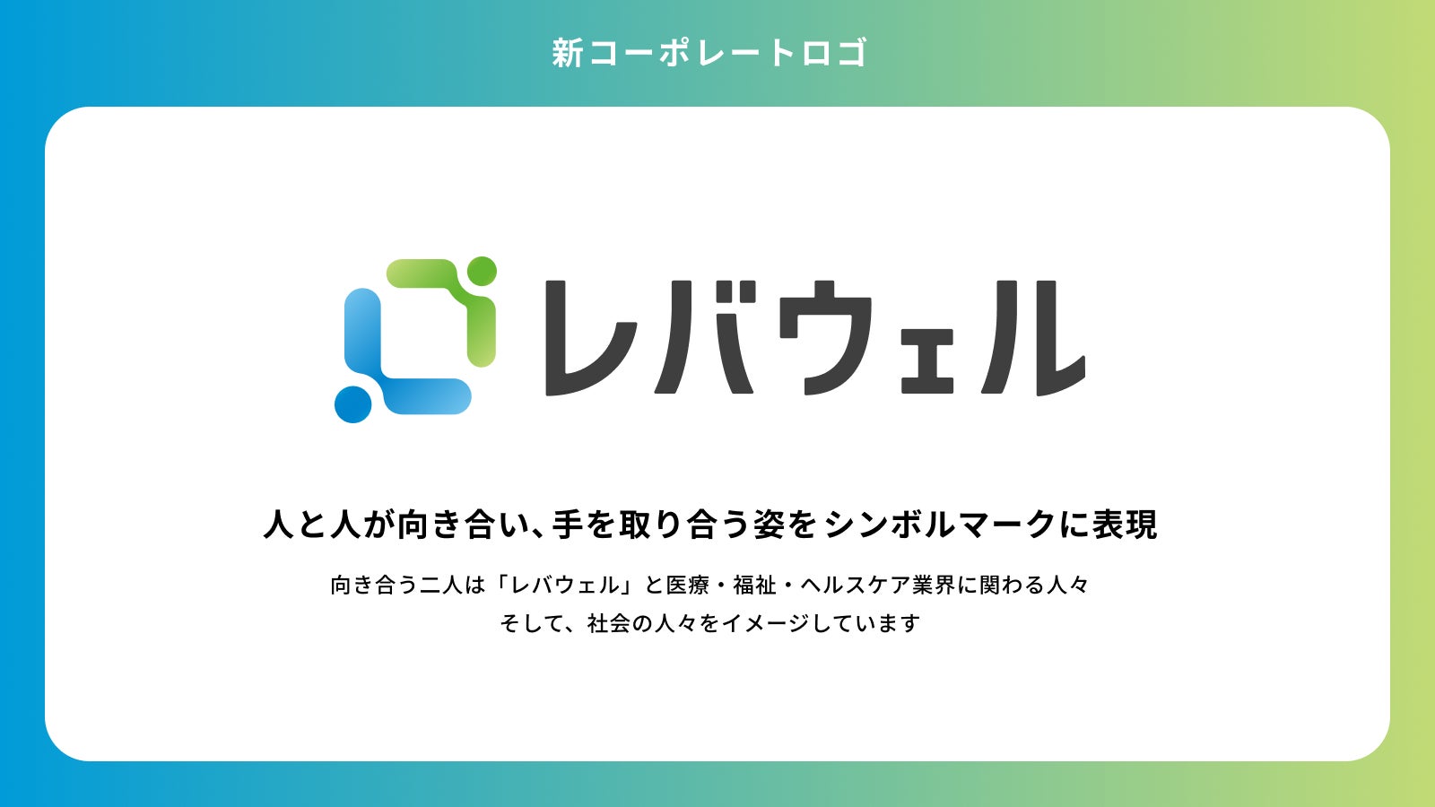 新コーポレートロゴ:レバウェル株式会社のロゴマークは、人と人が向き合い、手を取り合う二人の形を表現しています。向き合う二人は「レバウェル」と、医療・福祉・ヘルスケア業界ではたらく人々、そして社会の人々を象徴しており、「人々の健康と生活を支える人たちが、前向きに働くことができる社会をサポートしていきたい」という想いが込められています。