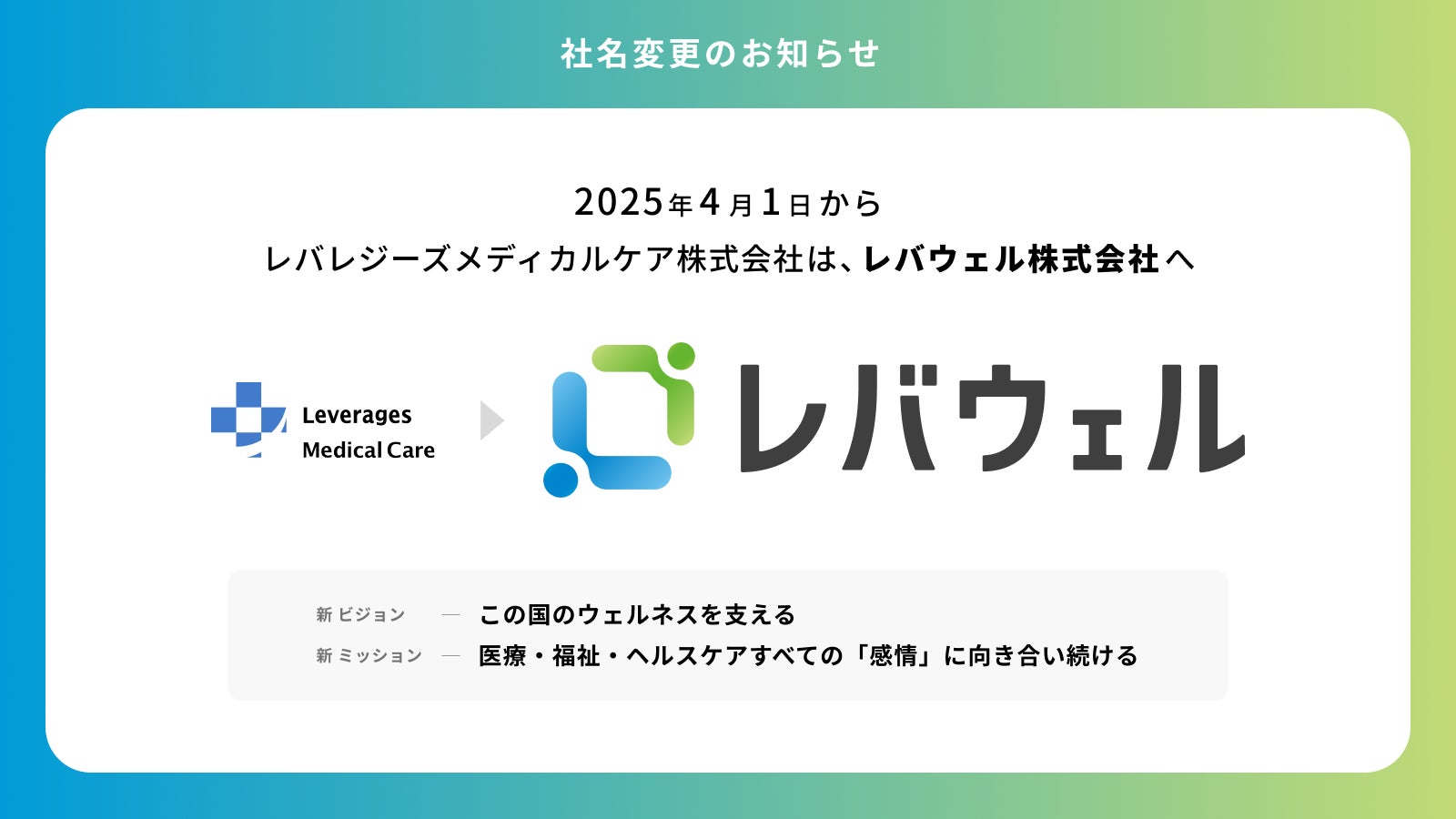 レバレジーズメディカルケア株式会社( https://leverages-medicalcare.jp/ )は、2025年4月1日(火)より、社名を「レバウェル株式会社」へ変更いたします。これに伴い、コーポレートロゴの刷新および新たなビジョン・ミッションを策定し、より一層の事業拡大と医療・福祉・ヘルスケア業界への貢献を目指してまいります。