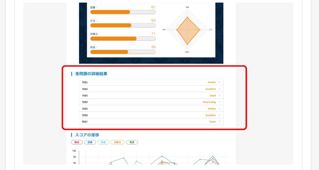 ネイティブキャンプでは、毎月無料で受験できる「AIスピーキングテスト」を導入しています。このテストでは、発音、流暢さ、文法の正確さ、語彙力などのスピーキングスキルを詳細に測定し、学習者が自身の英語力を数値化できます。これにより、「結果→目標→学習」という効果的な学習サイクルを確立し、継続的なスキル向上をサポートします。さらに、定期的にテストを受験することで、学習の進捗を可視化し、モチベーション向上にもつながります。