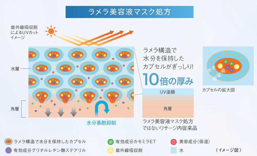 水分と油分が交互に重なるラメラ構造カプセルの働きで、長時間ベタつきなくうるおいを保持し、有効成分や美容成分(保湿)を届け続けます。