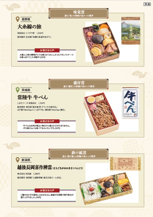 ※総合評価:駅弁の「味」「盛付」「掛け紙」の評価及び投票数による算出