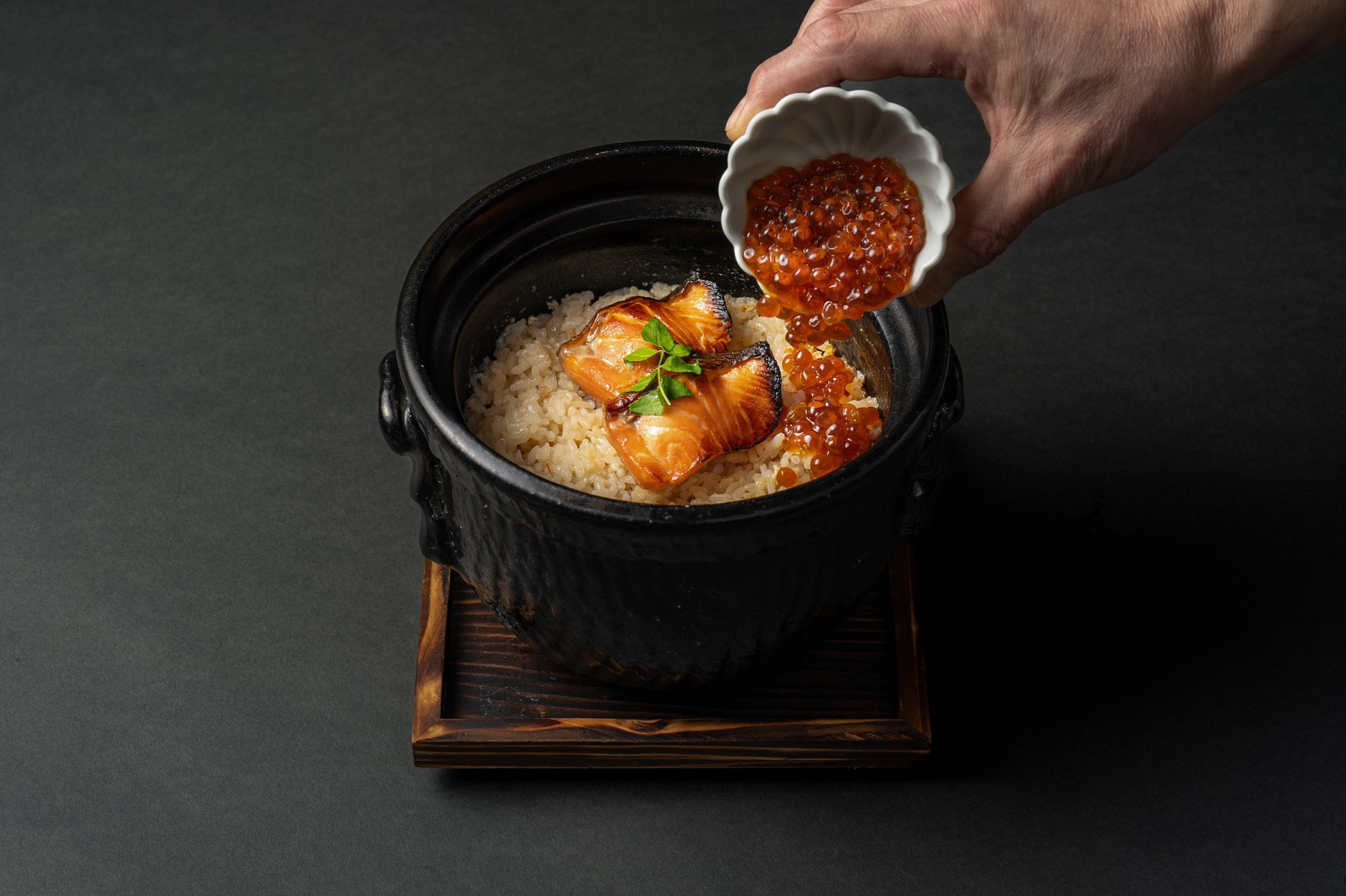 富士山サーモンの西京焼きとマグロ節、道南昆布の黄金出汁で炊き上げた土鍋ご飯です。仕上げにたっぷりの「シラリカいくら」をかけてお召し上がりください。