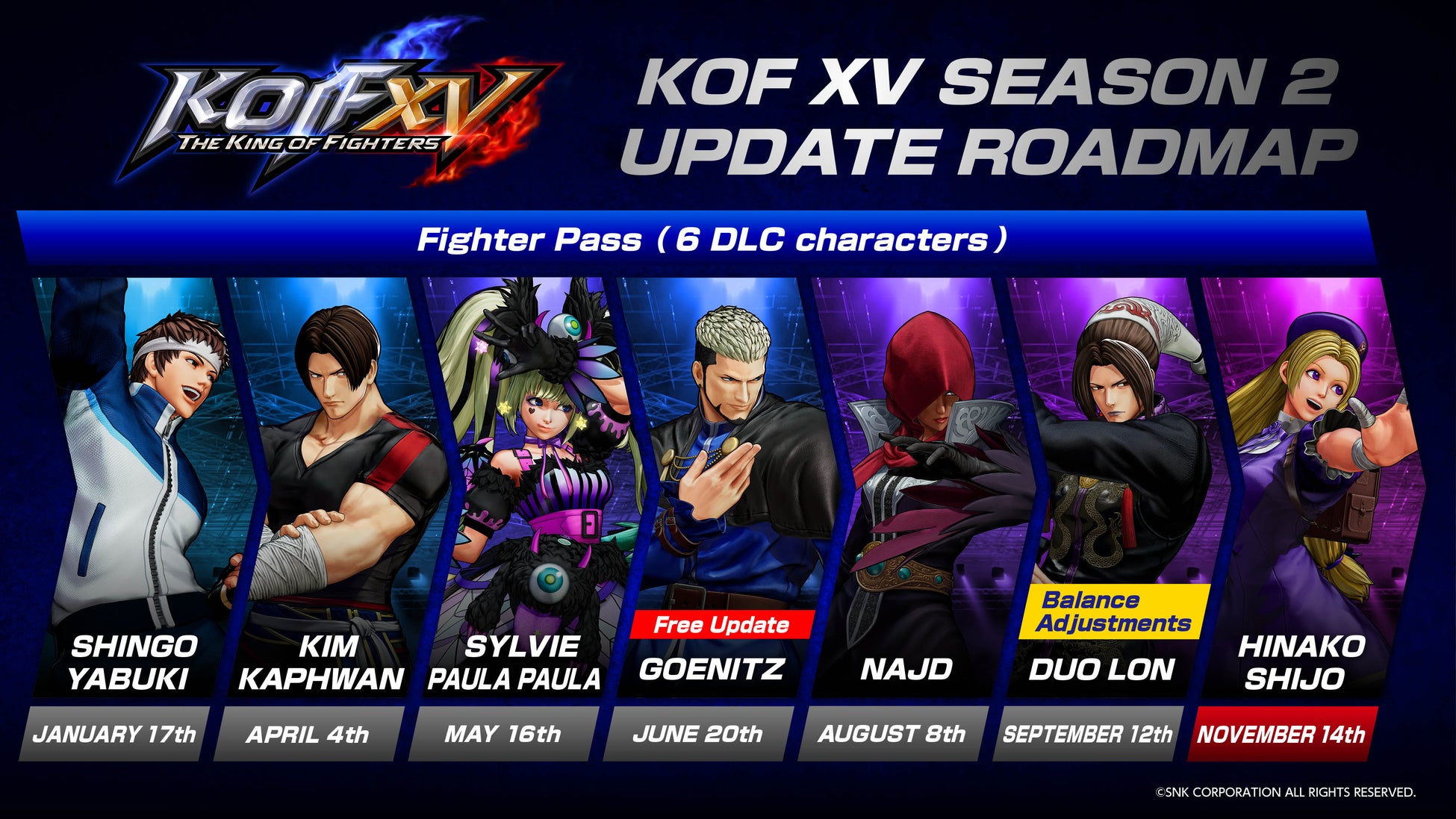『KOF XV』シーズン2では、無料配信の「ゲーニッツ」を加え、7体のDLCキャラクターが参戦。これからも進化を続ける『KOF XV』にご期待ください。