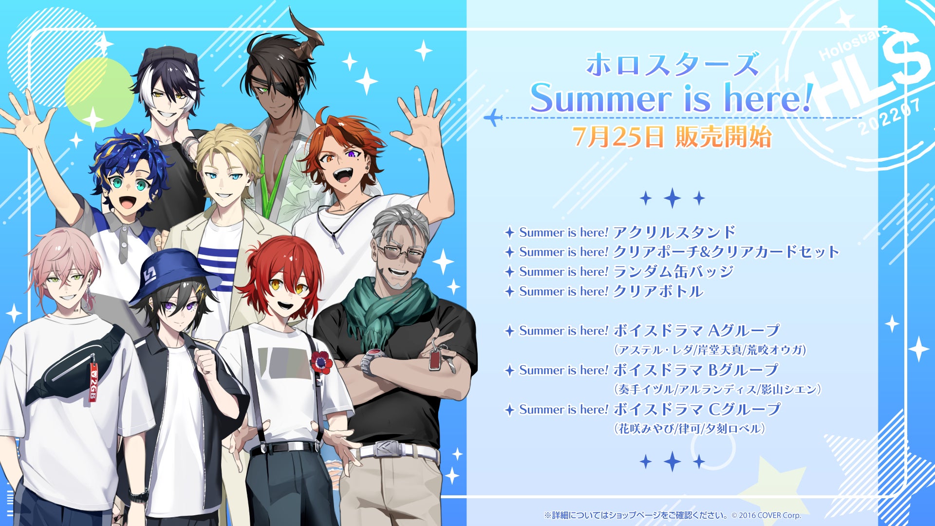 カバー株式会社(本社:東京都千代田区、代表取締役社長:谷郷元昭)は、当社が運営する「ホロライブプロダクション」傘下の男性VTuberグループ「ホロスターズ」において、2022年7月25日(月)19時より公式ECサイト「hololive production OFFICIAL SHOP」にて「Summer is here!」のオリジナルグッズを販売することをお知らせいたします。