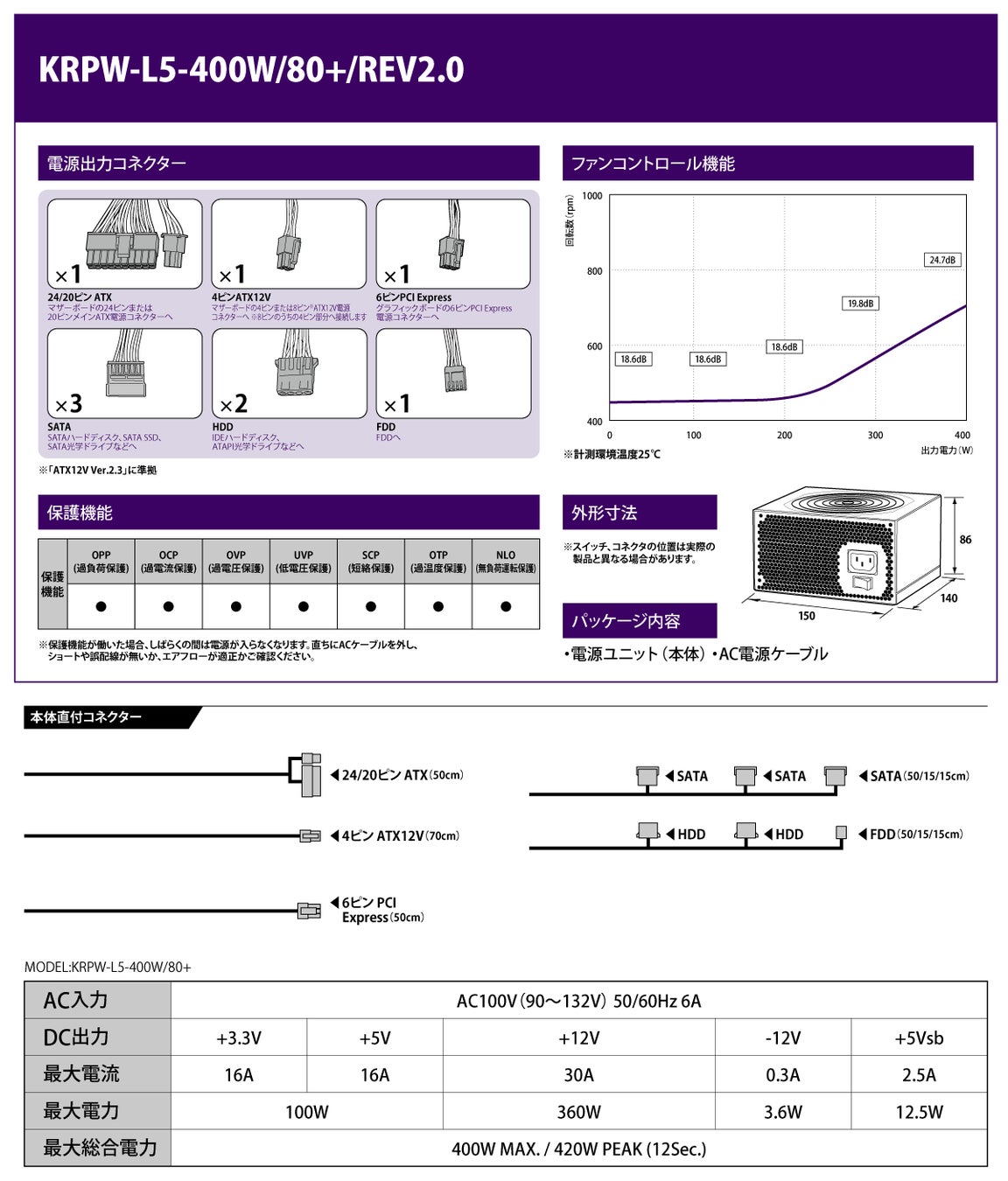 ■ KRPW-L5-400W/80+/REV2.0 (400Wモデル) / 80PLUS STANDARD ATX電源