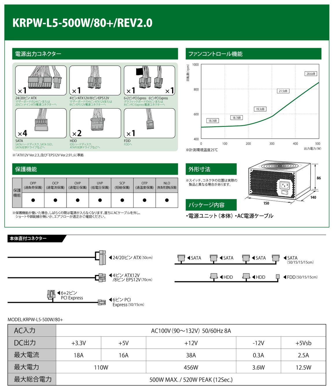 ■ KRPW-L5-500W/80+/REV2.0 (500Wモデル) / 80PLUS STANDARD ATX電源