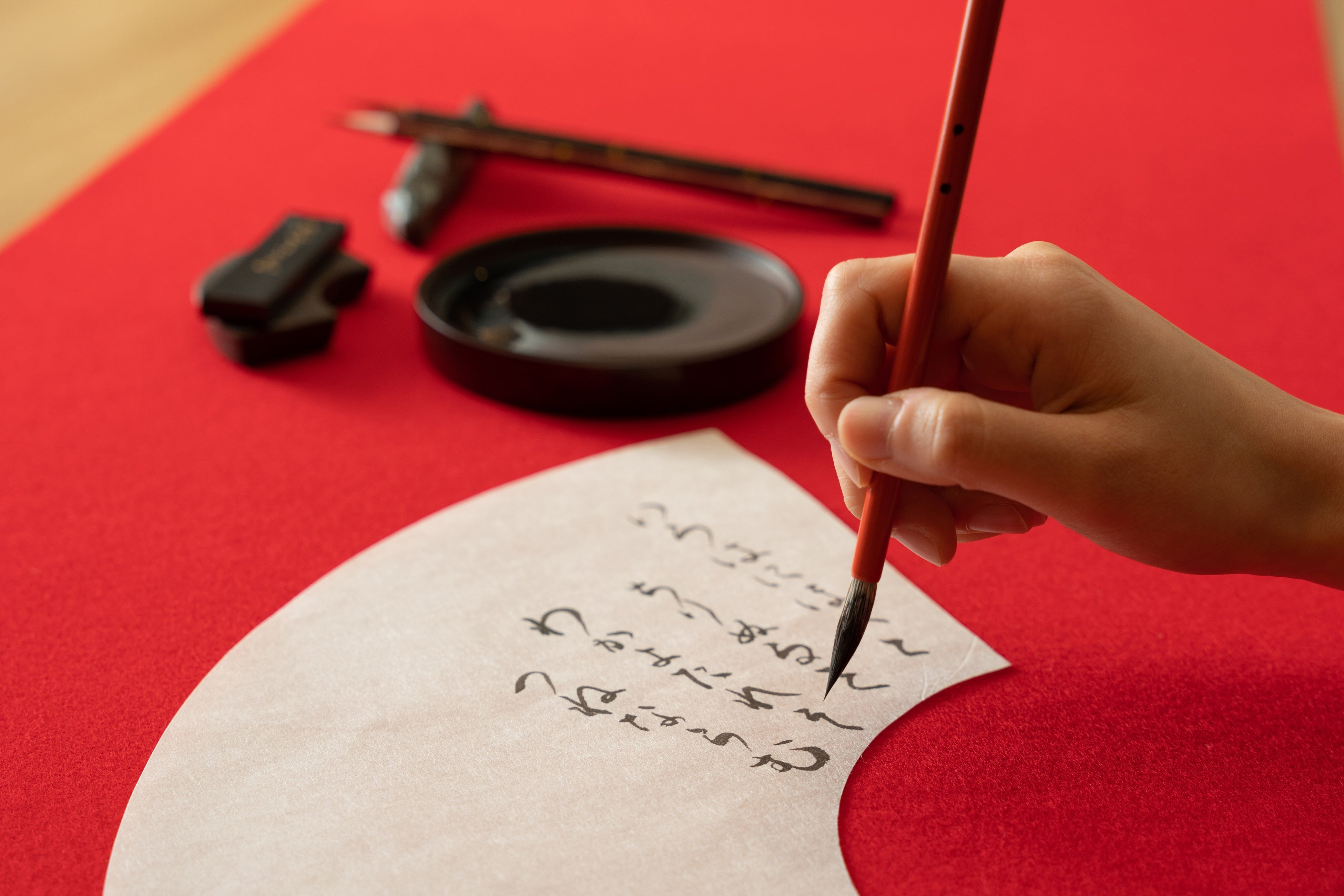 山口県の伝統工芸「赤間硯(あかますずり)」で墨をすり、そのすり心地、芳香を感じて、硯や墨に実際に触れて体験します。その後は扇形の型紙に自身の思いを綴ります。