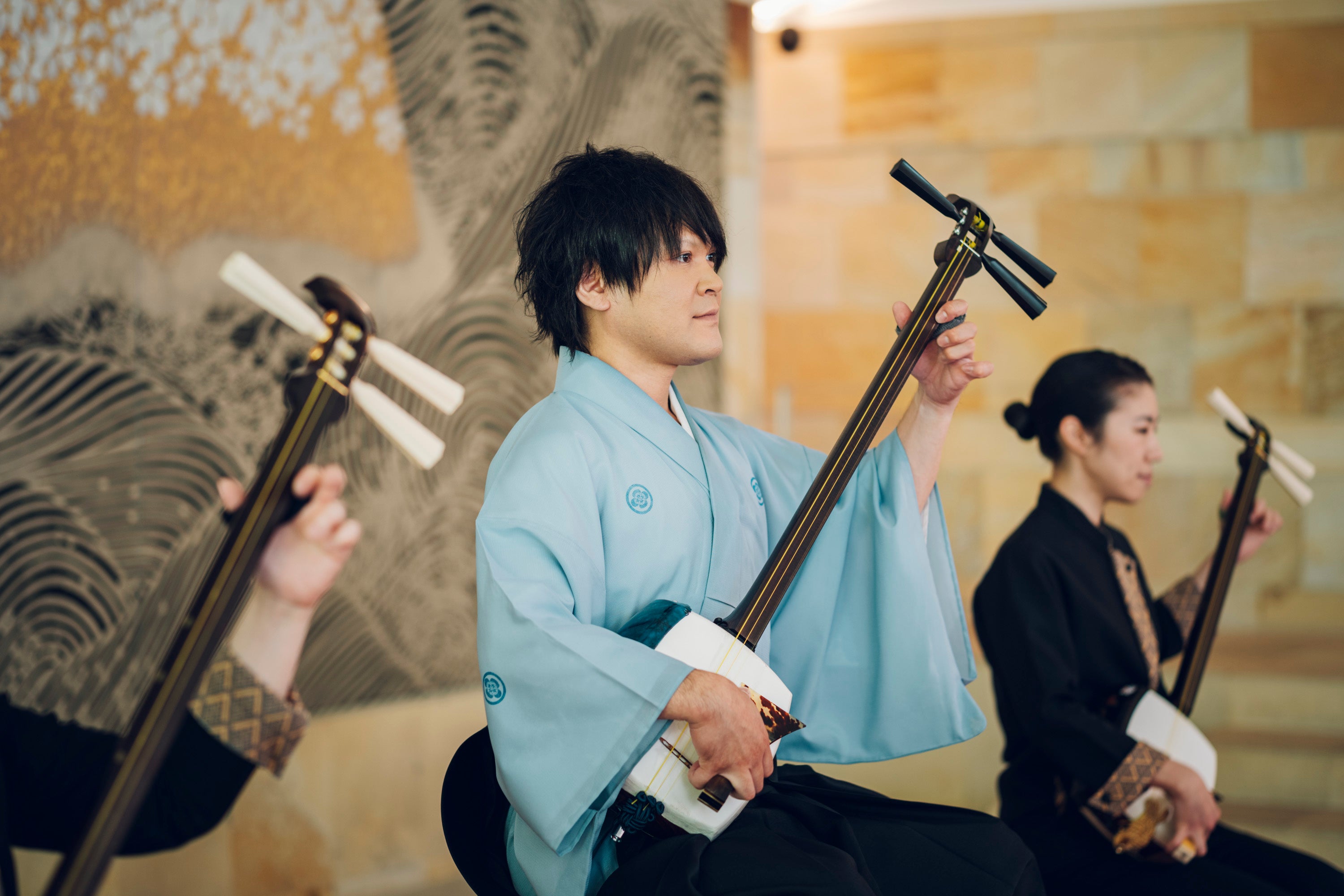 津軽三味線奏者とスタッフによる生演奏を毎晩行っています。日本画の巨匠・加山又造が津軽の四季を描いた大壁画『春秋波濤』を背景に、叩きつけるように奏でる津軽三味線の迫力ある音色に聞き入ります。