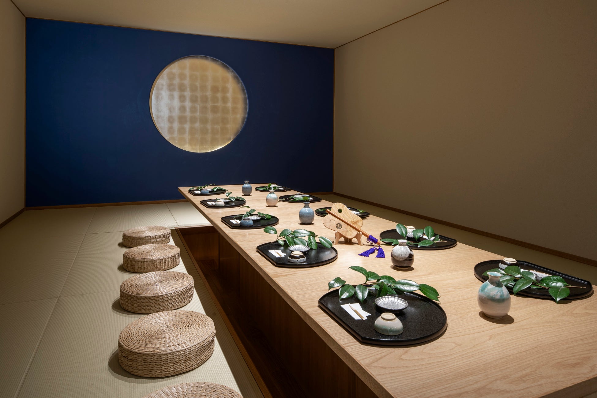 「勝色(かちいろ)」とも呼ばれる武士の間で縁起がよいとされてきた濃い藍色に、金の太陽のモチーフで伊達政宗公の軍旗をイメージした、ご当地楽専用の部屋を用意しています。そこに集い、伊達政宗公の水玉模様の陣羽織(じんばおり)をイメージした羽織に袖を通して、スタッフがご案内役となって宴を進めます。伊達政宗公は、心を許し合うにふさわしい者同士が、ふさわしい場所や会話、そしてその場にふさわしい酒と肴を楽しむことで人生を豊かにすると考えていました。また自ら鼓を叩いたり、飲食をふるまったりして客人をもてなしていたともいわれています。そんな史実やエピソードを知り、歴史に思いを馳せるときを過ごせます。