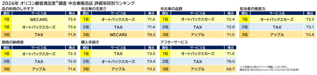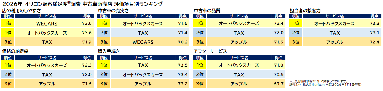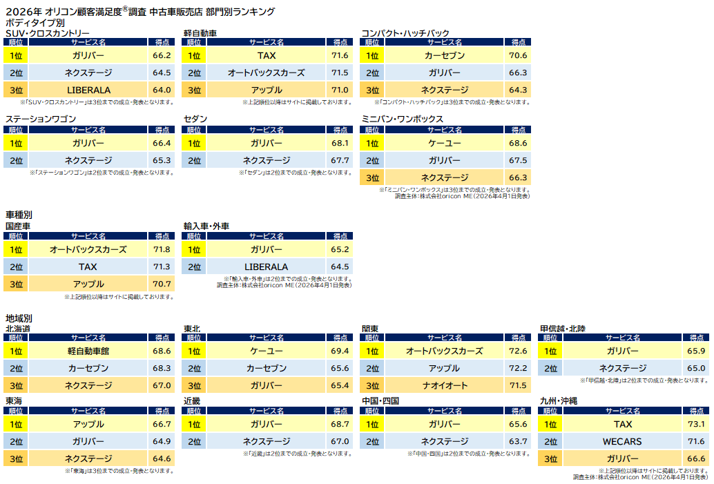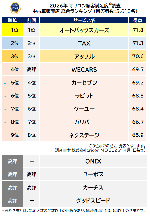 オリコン株式会社(本社:東京都港区 代表取締役社長:小池 恒、略称:オリコン)は、グループ会社である株式会社oricon MEが、実際のサービス利用者を対象に第三者の立場で実施した『中古車販売店』の顧客満足度調査の結果を、2026年4月1日(水)14時に「オリコン顧客満足度®」公式サイト内にて発表いたしました。ランキングの結果は下記の通りとなりました。