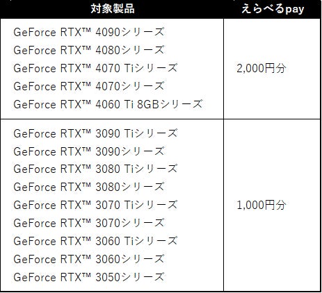 ・えらべるPayギフトカード2,000円分(RTX 40シリーズをレビューの場合)
